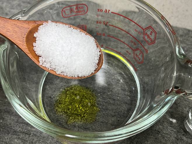 굵은소금 또는 꽃소금을 1스푼 넣습니다. 소금은 천연 재료로서 살균 및 항균 효과가 있습니다. 뿐만 아니라 기름기와 찌든 때 제거에도 도움이 됩니다.