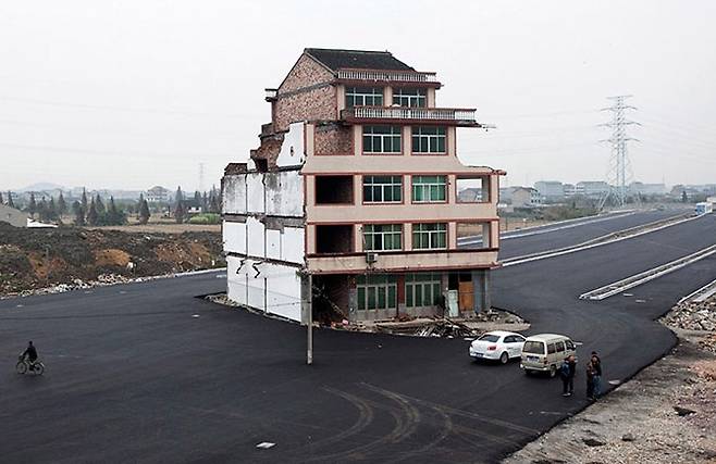 경사가 급한 곳에 있는 집은 풍수지리에서 재물을 잃는 곳으로 본다. 집 앞이나 옆의 경사가 심하면 지기가 집터에 모이지 못하고 소멸돼 버린다고 한다. 재산은 물을 따라 움직이는데 물이 급하게 내려가면 재산도 비탈길을 따라 빠르게 빠져나간다고 한다. 회사 사옥으로 이러한 건물을 사용한다면 돈이 쌓이지 않고 도산까지 할 수 있다.