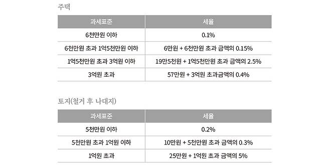 취득세 : 땅이나 땅을 바라고 구옥을 사는 경우 취득세를 내게 된다. 이때 취득세뿐만 아니라 농어촌특별세(농특세)와 지방교육세를 함께 납부하는데, 일반토지와 농지가 조금 다르다. 일반토지는 취득세는 토지 매매가의 4%, 농특세는 0.2%, 지방교육세는 0.4%, 총 4.6%로 책정되고, 농지는 취득세 3%, 농특세, 0.2%, 지방교육세 0.4%로 계산된다. 다만, 농지도 본인이 직접 농사짓기 위한 토지라면, 2년 이상 경작을 전제로 취득세 1.5%, 지방교육세 0.1%, 농특세는 면제된다. 만약, 건축주가 토지(전이나 답 등 농지) 구입 후 바로 건축하지 않는다고 하면 생각해 볼 만한 지점이다.