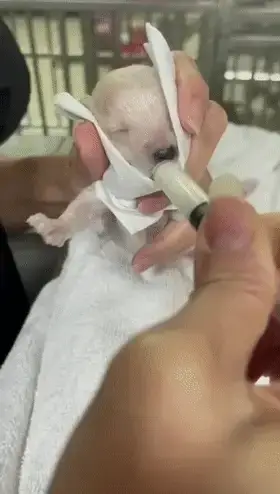 강아지가 막 태어났을 때, 몸이 작고 배꼽 줄이 배를 감싸고 있어서 엄마 개가 그를 물어 옮기려다가 힘 조절을 잘못해 실수로 그의 턱을 물어뜯었습니다. 이 부상은 강아지의 빨고 삼키는 능력에 영향을 미쳐 상황이 매우 좋지 않았습니다.