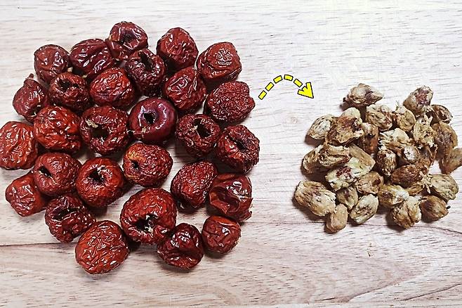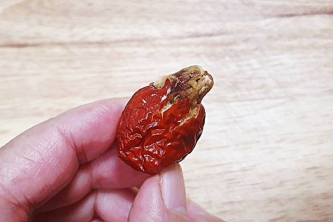 이쑤시개로 뺀 대추씨예요. 대추의 모양이 손상되지 않도록 깔끔하게 잘 분리가 됐습니다.