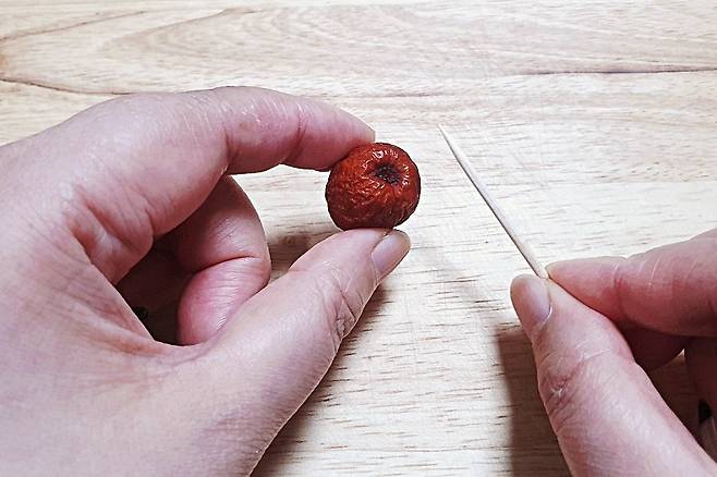 방법은 간단해요. 이쑤시개로 대추에 콕 찔러 속으로 점점 들어가면서 씨 겉면을 2 바퀴 정도 빙 돌려주세요.