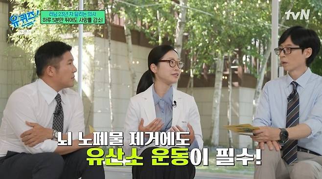 뇌도 달려야 좋아진다고. 정세희는 "뇌가 에너지가 필요할 땐 피를 통해 에너지를 받는다"라며 혈관이 건강해야 한다고 밝혔다. 뇌에 쌓인 노폐물을 빨리 제거하는데도 유산소 운동이 필수라고. 유재석이 "하루에 얼마나 달려야 좋냐"라고 묻자 정세희는 "숨이 차는 중강도 유산소 운동을 일주일에 2시간 반 하란 거다. 하루에 30분씩 5번 하면 된다"라고 밝혔다. 유재석은 "쉽지 않다. 걷는 거 안 되냐"라고 하기도. 정세희는 "지난주엔 110km 뛰었고, 오늘도 14km 뛰었다"라고 밝혔다.