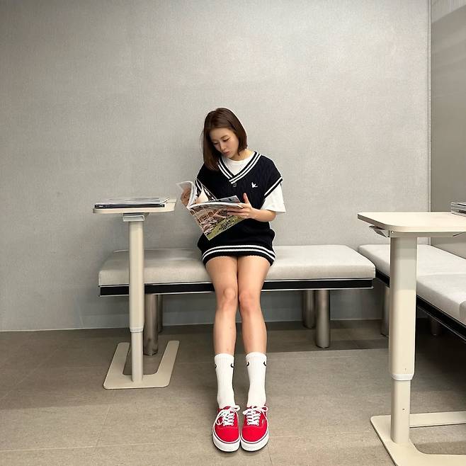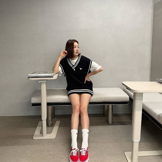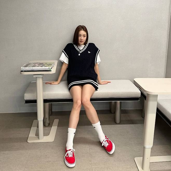 무릎 위까지 오는 하이삭스와 레드 스니커즈로 마무리해 포인트를 줬어요