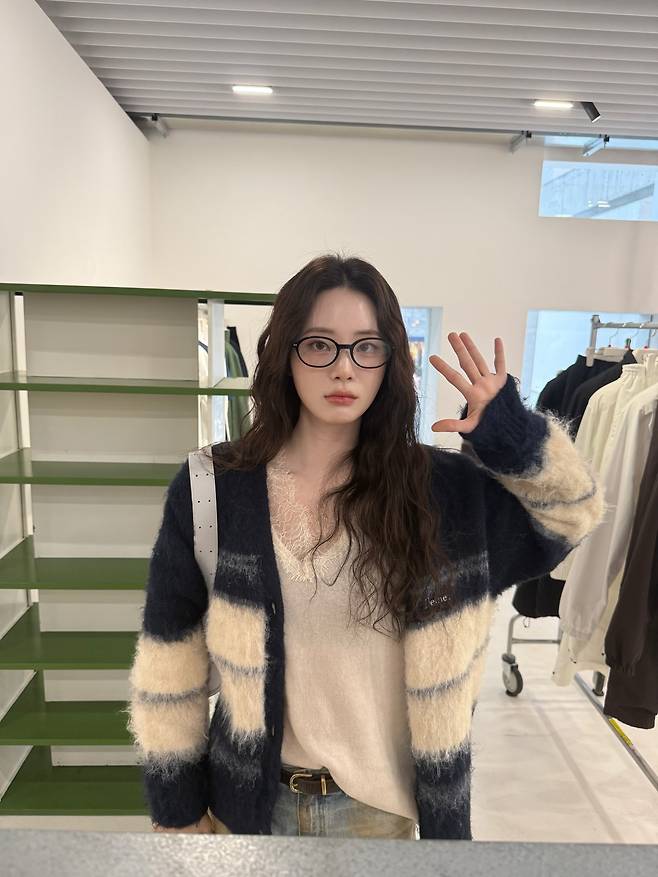 여기에 검정색 뿔테 안경을 착용해 평소의 신비로운 이미지에 지적인 매력까지 더하며 본인만의 유니크한 스타일을 완성했죠.