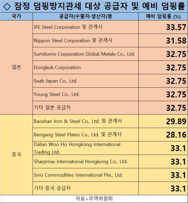 일본 공급자 중 JFE스틸은 33.57%, 일본제철은 31.58%로 최고 수준의 잠정 덤핑률이 매겨졌고, 중국 측은 바오산강철이 29.89%, 번시강철은 28.16%로 집계됐다. 기타 수출자는 32~33%대 수준에서 부과 건의됐다.