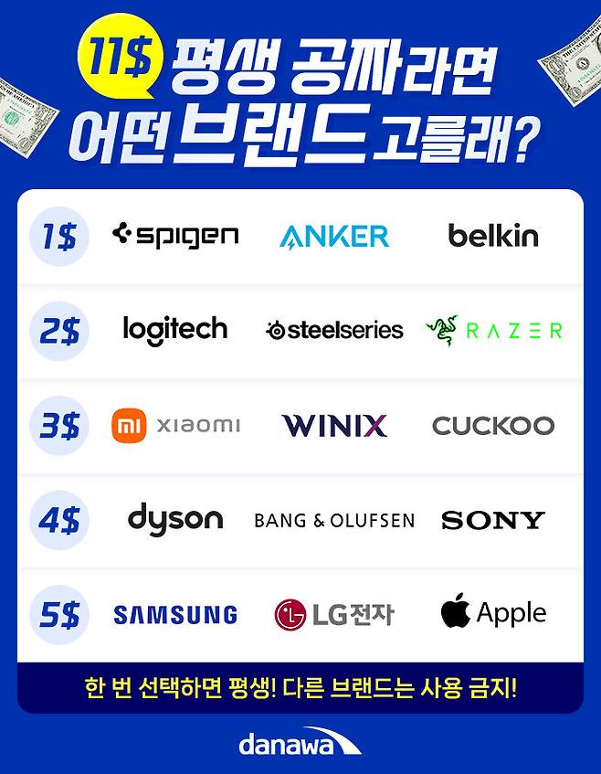 만약에 평생 공짜로 쓸 수 있는 전자제품 브랜드를 고른다면, 당신은 어떤 브랜드를 선택할 것인가? 전자제품 브랜드의 가치와 주요 제품군 가격대를 고려해 1$부터 5$까지 나눠봤다. 당신에게 주어진 11$로 내가 평생 쓰고 싶은 전자제품 브랜드를 취향껏 골라보자. 참고로 선택한 브랜드 외 다른 브랜드 제품을 사용하는 순간 사용하던 전자제품은 모조리 빼앗기니 신중하게 선택해 보자.
