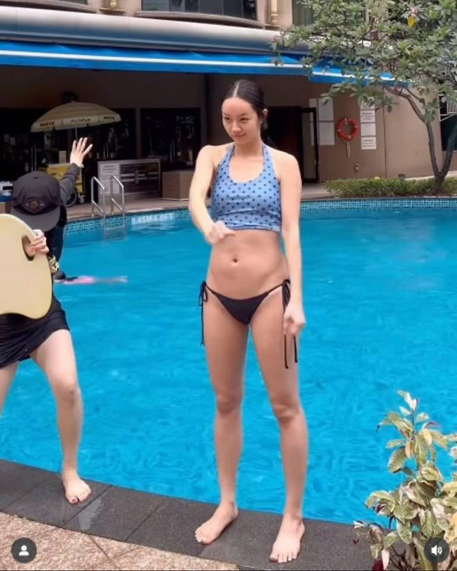 혜리 씨는 크롭톱 디자인의 비키니 상의와 허리 라인을 과감하게 드러내는 블랙 스트링 하의를 매치해 눈길을 끌었습니다. 파란색 도트 무늬의 스포츠 브라 스타일 상의는 혜리 씨의 발랄한 매력을 더욱 돋보이게 했습니다. 한눈에 봐도 완벽한 비율을 자랑하는 혜리 씨는 군살 하나 없는 탄탄한 몸매를 선보이며 많은 이들의 워너비 스타임을 입증했습니다.