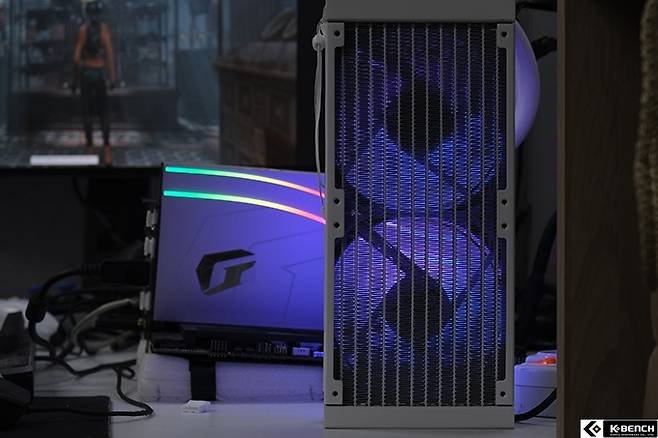공냉 모델은 PC 내부 온도를 높이는 주범이지만 컬러풀 iGame 지포스 RTX 4070 Ti 넵튠 처럼 그래픽카드까지 수냉이면 PC 외부에서 유입된 찬 공기가 그대로 양쪽 라디에이터로 흘러가게 된다.
