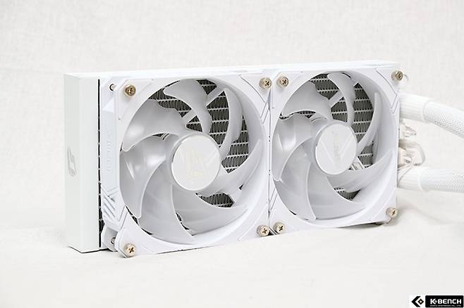 라디에이터는 일반적인 수냉 쿨러와 큰 차이는 없다. 120mm 팬이 2개 설치된 240mm 2열 모델이고 두께도 두껍거나 얇지 않은 딱 표준 사이즈다. 장착된 팬은 RGB LED에 듀얼 볼 베어링 모델이다. 듀얼 볼 베어링은 수명이나 소음 면에서 일반적인 슬리브 타입보다 특성이 좋은 고급 모델이다.
