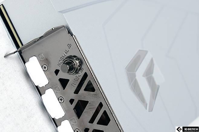 컬러풀 iGame 지포스 RTX 4070 Ti 넵튠은 듀얼 바이오스를 제공한다. 디스플레이 출력 포트 쪽에 배치시킨 버튼만 누르면 노멀과 터보 모드를 자유롭게 변경할 수 있다. 물론, PC 전원을 끈 상태에서 조작해야 해당 모드로 전환하는 것이 가능하니 참고하기 바란다.