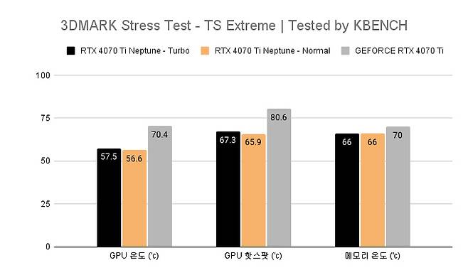 실제, 스트레스 테스트 후 최고 온도를 비교해 봐도 노멀 기준 56.6도, 터보 기준 57.5도를 기록한 컬러풀 iGame 지포스 RTX 4070 Ti 넵튠와 달리 3열 대형 히트싱크와 트리플 팬 조합인 공냉 모델은 70.4도가 한계였다.