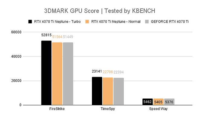 오늘은 자세한 비교는 하기 어렵고 공냉 쿨러의 레퍼런스 클럭 대비 컬러풀 iGame 지포스 RTX 4070 Ti 넵튠의 노멀, 터보 모드 성능이 어떤가를 간단히 비교만 해볼 텐데 위 결과가 3DMARK로 테스트 한 것이다.