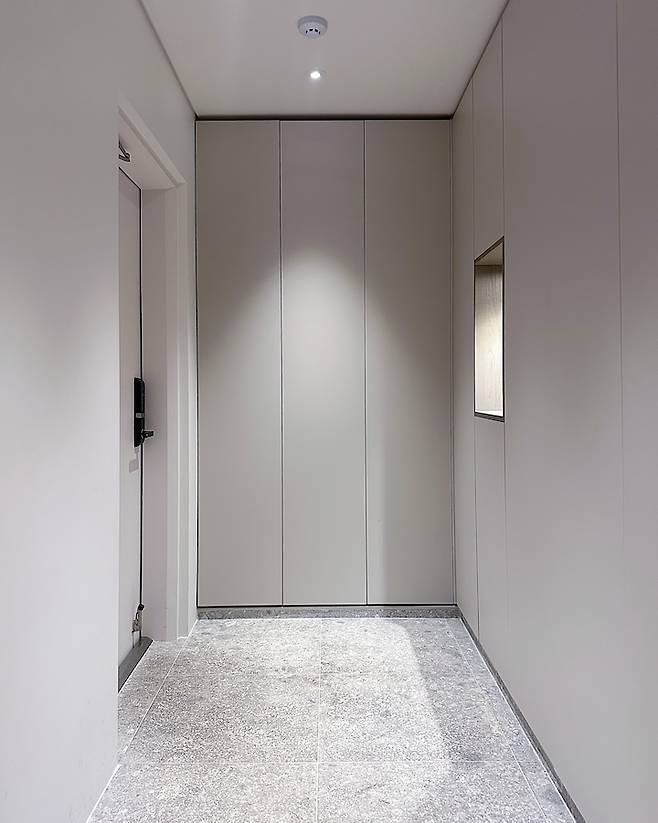 기존에는 폭이 애매하게 넓으면서 신발장 공간이 부족했던 터라 폭을 더 줄이면서라도 신발장 공간을 충분히 만들었습니다. 천장을 높이고 기존보다 깔끔한 톤과 선으로 정리해서 좁다는 느낌이 별로 들지 않는 공간이 되었어요.