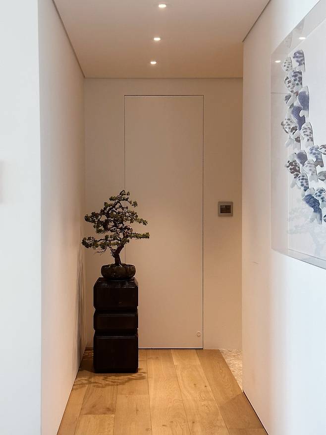 현관 정면에 원목 스툴을 두고 그 위에 분재를 올려두고 있는데 계절별로 바꾸어 주고 있어서 손님들도, 가족들도 집에 들어오자마자 그리고 집을 나서면서 언제나 작은 자연을 느낄 수 있습니다.