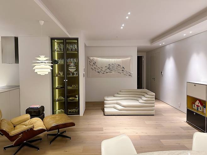 아이가 걷기 시작하자마자 아이 짐을 거실에서 치우고 거실로서의 기능에 충실한 공간을 만들기 시작했습니다. 40평대 치고는 거실이 넓지 않은 편이라 기존에 있던 3인용 소파를 처분하고 작은 소파 그리고 라운지체어를 둠으로써 공간을 좀 더 확보할 수 있었어요.
