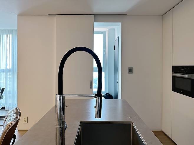 단점이 있다면 수전이 너무 높아서 물이 튈 수도 있어서 수압 조절에 요령이 필요하다는 것. 리모델링 전에는 주방 베란다에 보조 주방이 있었는데 리모델링하면서 굳이 필요 없을 것 같아서 없애면서 건조기를 넣었습니다.
