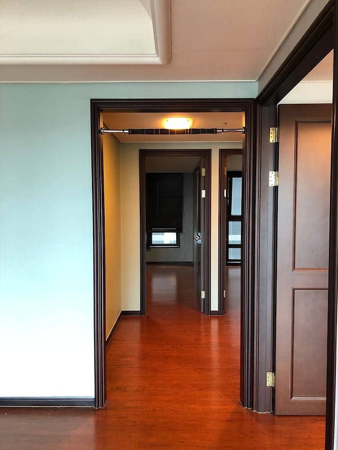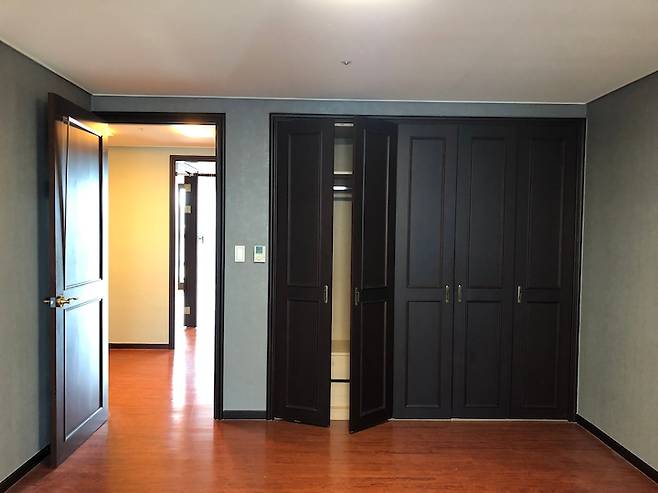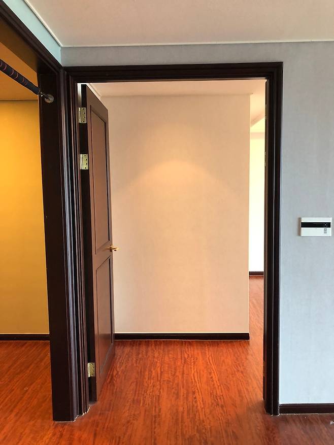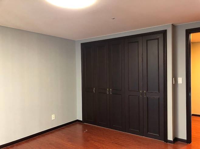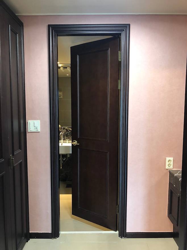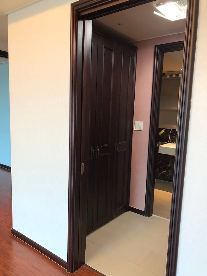 가장 구조변경이 많았던 안방은 안방과 방 하나를 연결해서 하나의 공간으로 만들게 되면서 원래는 거실 한편에 있던 안방 문을 좀 더 안쪽으로 옮길 수 있게 되었습니다.