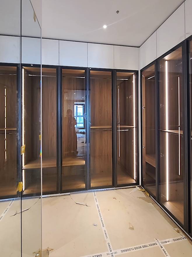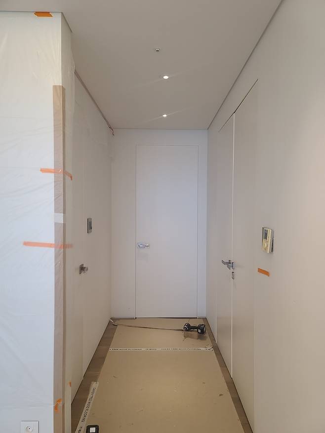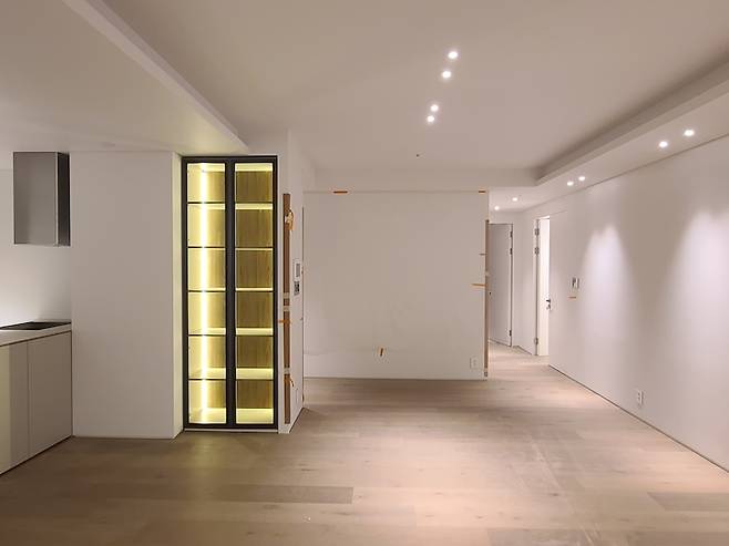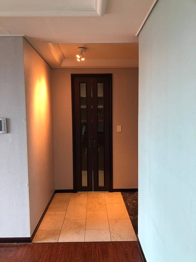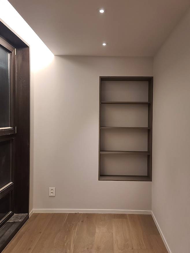 그리고 사진으로는 잘 느껴지시지 않으실 수도 있지만 기존에는 현관을 들어오면 바로 거실이 보였는데 그 부분이 싫어서 어느 정도 복도형 현관을 느낄 수 있도록 현관 정면에 가벽을 더 늘려 현관을 들어오면 바로 거실이 보이지 않고 거실에서도 현관이 바로 보이지 않게 되어 만족스럽습니다.