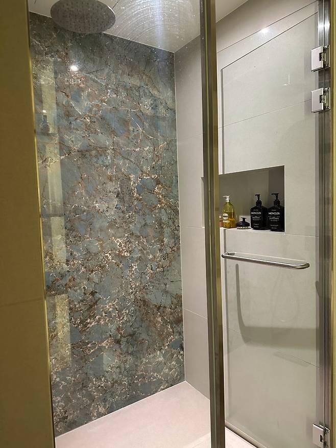 아이를 키워 보니 아이 목욕시키고 하는데 생각보다 공간이 필요한데 샤워실이 넓어서 너무나 편하게 사용 중입니다. 그리고 수전들은 이탈리아 브랜드인 트리미를 사용하고 있는데 수전이 얇고 물줄기도 얇게 나와서 사용하면서 늘 감각적이라고 느껴요.