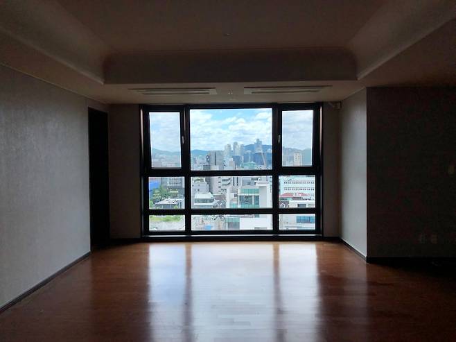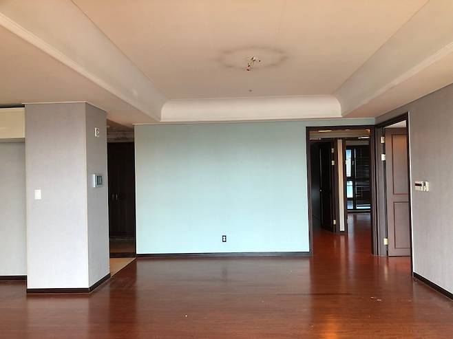 우물천장과 무몰딩 도장 벽 시공을 하고 바닥은 원목 광폭 강마루로 교체하여 다소 칙칙했던 기존의 거실보다 훨씬 더 밝고 깔끔해진 거실입니다. 기존의 몰딩들이 진한 색이라 무몰딩으로 바꾸고 나니 훨씬 더 집이 모던해졌어요.