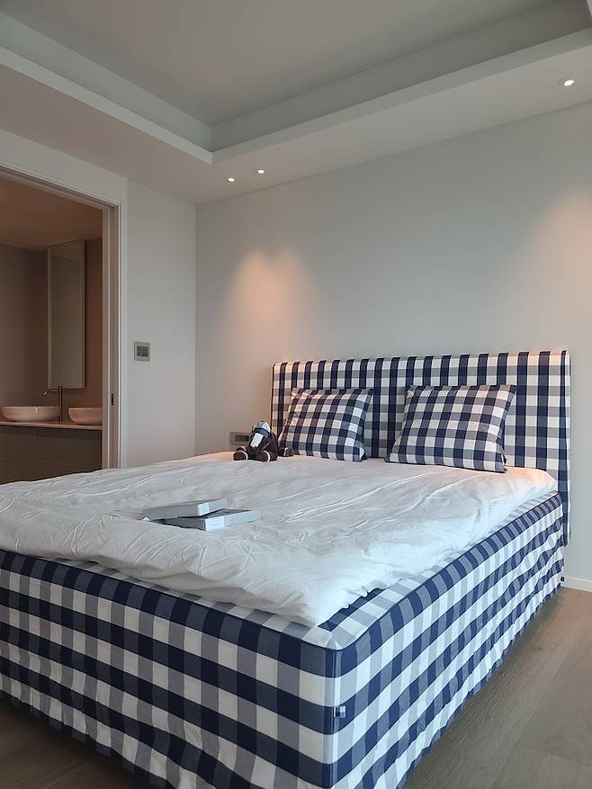 가장 많은 구조변경이 이루어진 안방입니다. 기존에는 침실과 욕실 그리고 파우더룸으로 이루어진 공간이었는데 남는 방 하나를 안방 쪽으로 흡수시키면서 서재와 드레스룸이 안방에 추가가 되었어요.