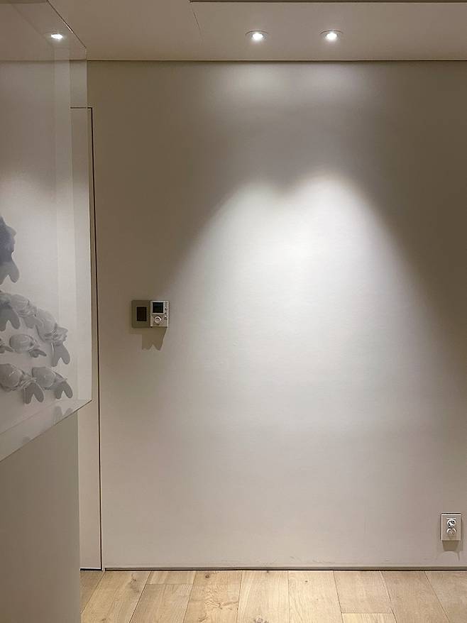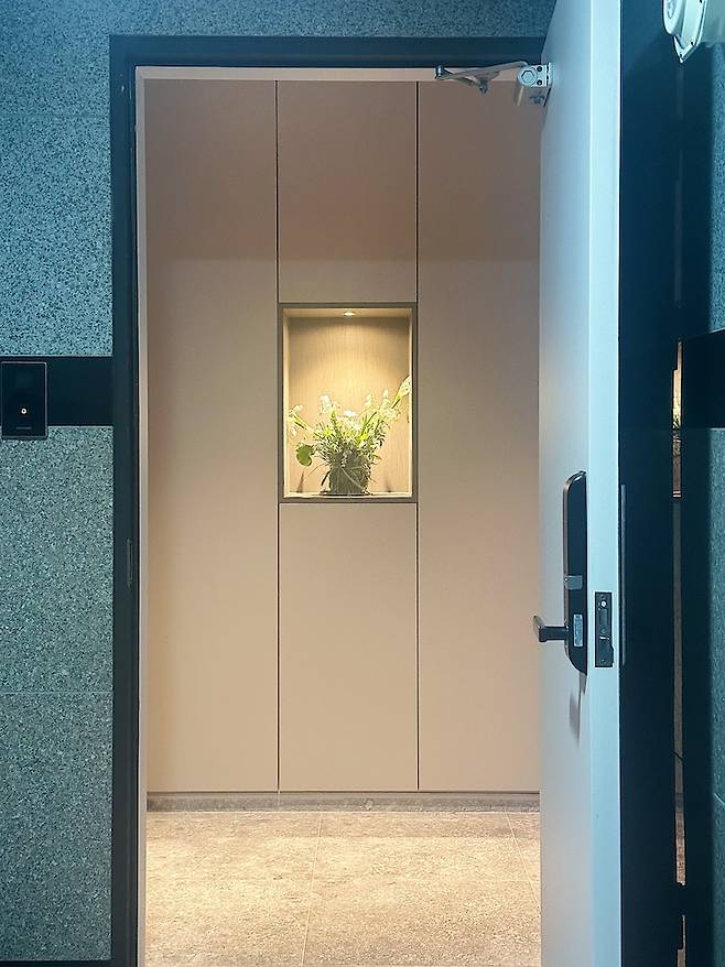 현관문 정면에 조명이 들어간 공간박스를 만들어 두었는데 그 공간에 다양한 장식품을 두면서 집에 들어오거나 나갈 때 포인트가 되어 좋아요.