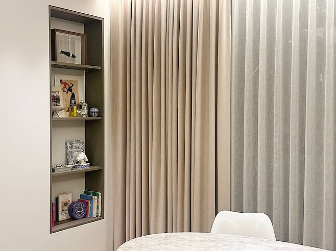 그리고 안방 베란다로 나가는 문이 있던 자리에 만든 매립장 덕분에 수납공간이 늘어나 가구를 더 두지 않아도 충분한 수납이 가능하고 또 미적으로도 예뻐서 너무나도 잘한 시공 중 하나라고 생각합니다.