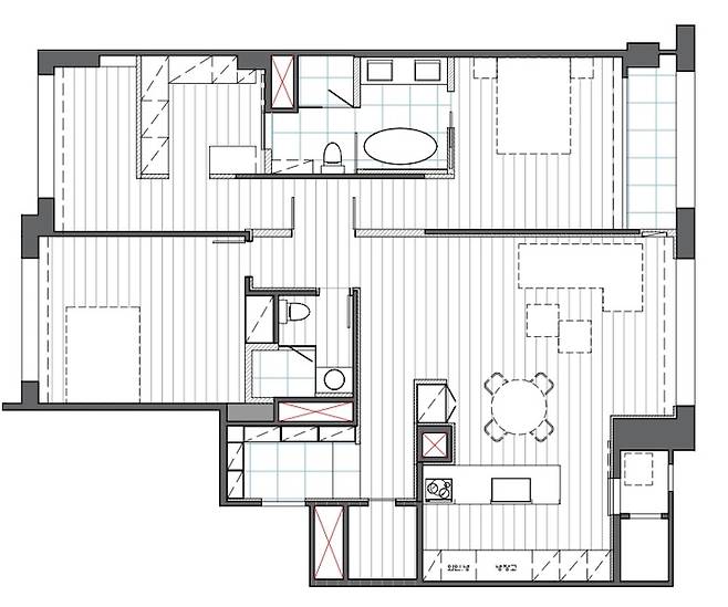 저희 집은 2베이 구조의 아파트라 거실과 안방은 남향이지만 나머지 두 개의 방은 북향이라 어두워요. 그런 부분에 대한 단점을 최대한 극복할 수 있기를 원했고 기존에 살면서 불편했던 부분들을 구조변경을 통해서라도 많이 개선할 수 있도록 밑그림을 그렸습니다.