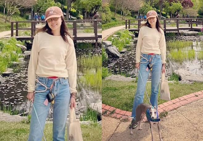여기에 야구 모자와 틴트 선글라스, 쇼퍼백까지 더해지며 힙하고 쿨한 무드가 완성됐고, 반려견 산책 중에도 흐트러짐 없는 꾸안꾸 감성이 빛났습니다.