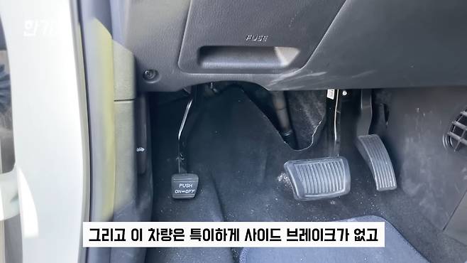 그리고 이 차량은 특이하게 사이드 브레이크가 없고 풋 파킹 브레이크가 적용되어 있거든요. 처음에는 조금 불편했거든요. 그 전에 제가 소나타 1.6 터보에는 전자식 파킹 브레이크가 들어가 있거든요. 그것만 까딱 하면 끝인데 처음에는 헷갈렸습니다만 익숙해지니까 편하더라고요. 그리고 이 차량 특이하게 B필러 쪽도 아예 그냥 슬라이딩 도우로 모두 열려버리는 스타일이기 때문에 조수석 쪽의 안전벨트가 운전석과 다르게 조수석 시트 우측 상단에 붙어있더라고요.