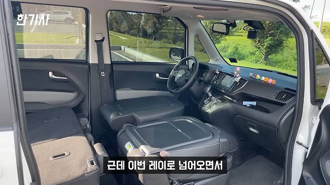 이 차량이 공간 활용도를 높이기 위해서 법규가 정한 경차 기준의 한계까지 끝까지 밀어붙인 차체 크기 덕분에 경차임에도 불구하고 여유 공간이 상당한 편이거든요. 그리고 조금 특이한 점이 비대칭형 도어가 적용되어 있는데요. 운전석 쪽이 일반 도어고 조수석 쪽이 슬라이딩 도어로 적용되어 있는데 운전석이 앞 도어가 약 65도 정도로 열리는 반면에 조수석 쪽이 앞 도어는 90도로 아주 활짝 열리잖아요. 그렇기 때문에 조금 더 넓은 실내 공간을 부각을 시켜줄 수 있는 것 같아요.