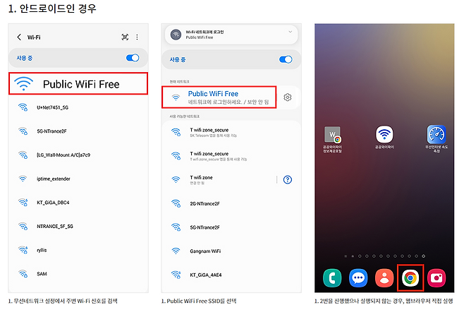 -‘Public Wi-Fi Free’ SSID를 선택하고 웹브라우저 실행합니다. (단말기의 기본브라우저 사용권장)