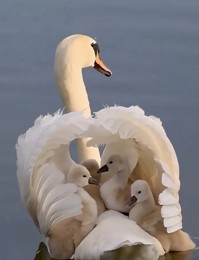 백조는 사회적으로 강한 모성애로 잘 알려져 있는 새입니다. 영상 속 엄마 백조는 아기 백조들을 자신의 날개 아래 품으며 한순간도 그들을 놓지 않습니다. 호수 위를 이동할 때도 아기 백조들이 물에 빠지거나 뒤처지지 않도록 날개로 감싸고, 때로는 등을 타고 올라타는 아기들을 편안히 받아줍니다. 이는 엄마 백조가 자식들에게 느끼는 깊은 사랑과 헌신을 단적으로 보여줍니다.