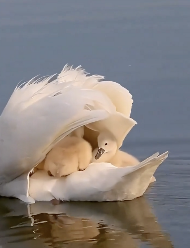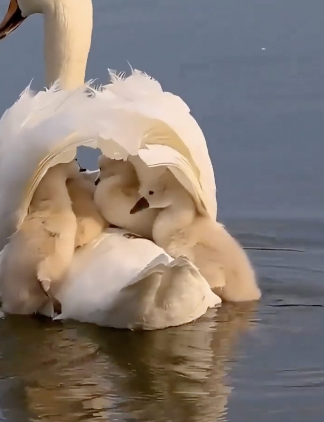 이처럼 엄마 백조가 아기 백조들을 품는 행동은 단순한 보호 본능에서 나오는 것입니다. 물속의 포식자로부터 아기들을 지키기 위한 자연스러운 방어 전략이기도 하지만, 동시에 따뜻한 둥지의 역할을 하는 엄마의 날개는 아기들에게 안정감과 안락함을 제공합니다. 아기 백조들은 이러한 보호 속에서 건강히 성장하며 세상을 배워나갑니다.