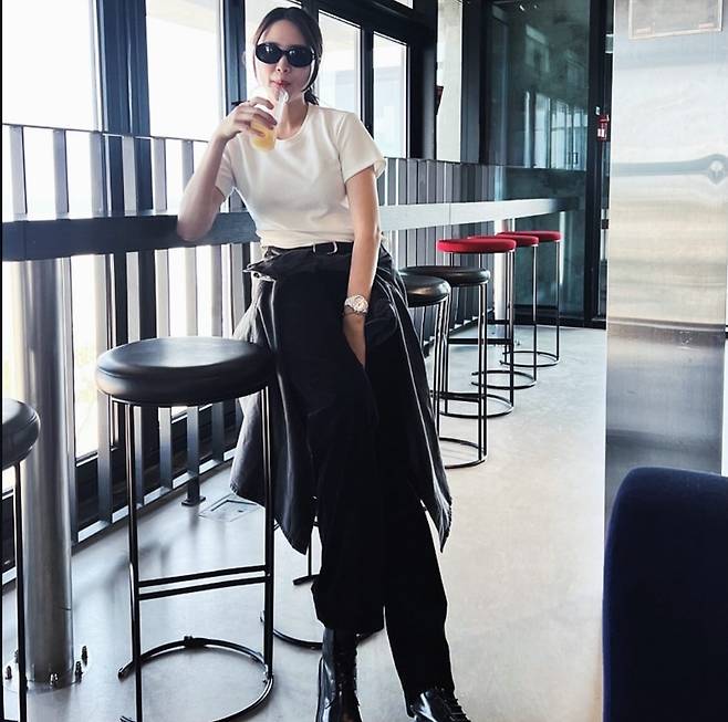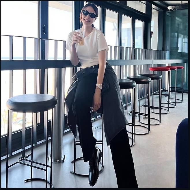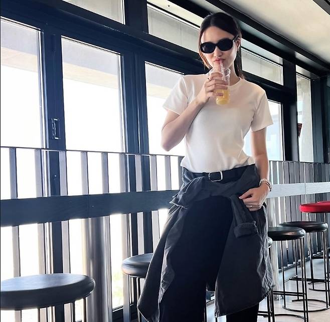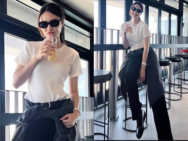 진아름은 깔끔한 화이트 티셔츠에 블랙 슬랙스를 매치해 군더더기 없이 세련된 분위기를 연출했습니다.