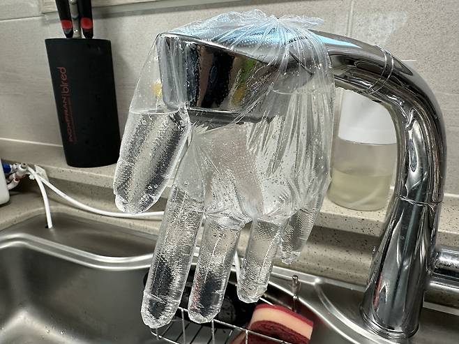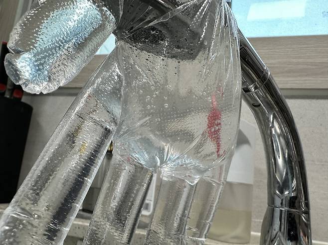 이제 위생장갑을 수전에 묶어주시면 되는데 잘 안 묶이면 고무줄을 이용하여 묶어주세요.