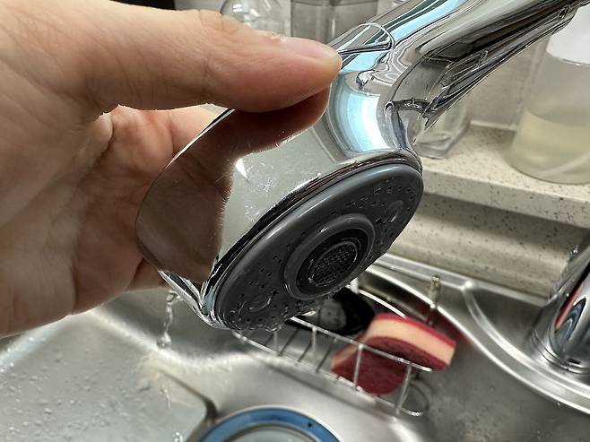 수도꼭지 입구를 보면 신축 아파트임에도 지저분한 물때가 있습니다.