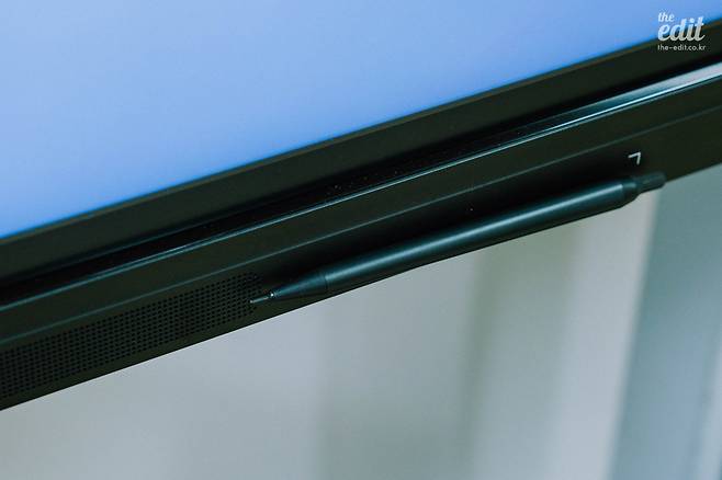 스피커 역시 전면부에 설치되어 있어서, 사운드 전달력도 뛰어납니다. 심지어 오랜 시간 사용하면 화면을 굉장히 가까이서 응시하기 때문에 눈이 피로하지 않을까 싶었는데, 모니터 깜빡임을 줄여주는 플리커 프리 기능으로 사용자의 눈 건강을 보호해 주는 제품이었습니다. 쓰지 않을 때는 2개의 펜을 전면 자석을 이용해 붙여둘 수 있다는 점도 깨알 같은 포인트죠.
