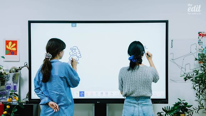 사실 저희는 회의나 아이디어 스케치 용도를 주로 사용했지만, ‘칠판’이라는 정체성을 가장 잘 활용할 수 있는 상황은 바로 수업이죠. 이렇게 손가락 터치와 펜 필기를 모두 활용할 수 있는 전자칠판이라면 수업에서의 활용도도 높을 것 같았습니다. 단순히 문제를 풀이하고, 설명하는 용도를 뛰어넘어서 직접 손끝으로 터치하고 도형이나 그림을 그려 넣어서 수업에 참여할 수 있다는 게 큰 메리트니까요. 게다가 필요한 자료나 이미지, 영상이 있다면 언제든지 파일을 열어서 화면 한쪽에 띄워둘 수 있다는 게 전자칠판의 매력이잖아요? 예를 들면, 칠판에 어떤 꽃을 그려보는 수업을 한다면 한쪽에 포털사이트 검색창을 띄워서 사진을 참고삼아 그려볼 수 있다는 뜻입니다. 이런 제품이 있다면 수업에서 학생들의 참여도 역시 드라마틱하게 오를 수 있다는 생각이 들었습니다.