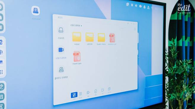 자체 안드로이드 시스템을 갖추고 있어서 모두에게 익숙한 인터페이스인 만큼, 따로 학습이 필요 없다는 점도 직관적이고 편리했습니다. 외부 파일을 편리하게 꺼내볼 수 있는데, 구글 드라이브나 원 드라이브 계정에 로그인해서 클라우드에 업로드해둔 리소스를 저장하거나 가져올 수도 있지만 직접 USB 스토리지를 연결해 파일을 불러오는 과정도 간단합니다. 우리에게 익숙한 인터페이스가 그대로 적용되어 있다는 것도 이 제품의 큰 장점이에요. 영상과 사진은 물론 PDF나 PPT 파일도 바로 열어볼 수 있습니다.