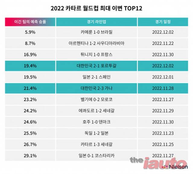 미디어 정보 분석 기업 닐슨미디어코리아가 2022 카타르 월드컵 최대 이변 12경기를 발표했다. 한국-포르투갈전은 4위에 선정됐다.