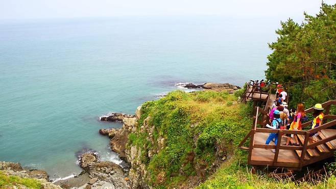 왼편엔 울창한 숲, 오른편엔 거센 파도가 부딪히는 절벽. 그 사이 나무 데크가 길게 이어지며 걷는 이의 발걸음을 인도한다.