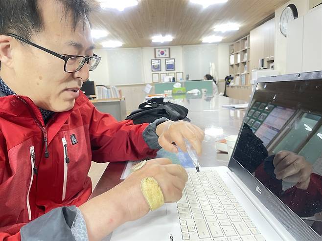 | ▲ 홍서씨는 척수사이 네이버 카페에 자신의 경험을 글로 남기고 있다. 보조기구를 이용해 글을 쓰는 모습 |