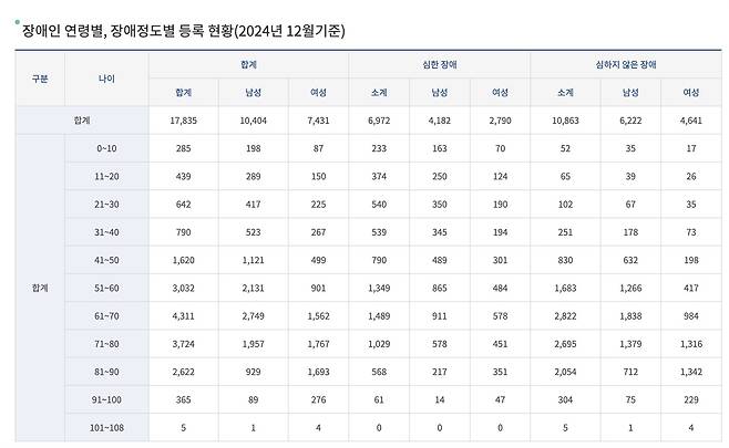 | 진주시에 등록된 장애인은 2024년 12월 기준으로 총 17,835명이다. 장애 유형별로 보면 지체장애인이 7,898명으로 가장 많고, 이어 청각장애 2,406명, 지적장애 1,721명, 뇌병변장애 1,634명, 시각장애 1,562명, 정신장애 898명, 신장장애 828명순으로 나타났다. 연령대별로는 61~70세가 4,311명으로 가장 많고, 그 다음은 71~80세 3,724명, 51~60세 3,032명, 81~90세 2,622명, 41~50세 1,620명 순으로 나타났다. |