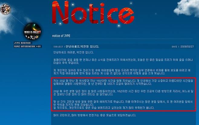 당시 박진영은 공식 입장문을 통해 '스무 살 때 만난 제 첫사랑과 지난 16년이란 시간을 함께 지내며 제 인생에서 가장 소중하고 아름다웠던 시간들을 함께하며 열렬히 사랑했다'라며 그러나 '16년이란 시간 동안 우린 조금씩 다른 방향으로 자라서 어느새 닮은 점 보단 다른 점이 더 많아졌다는 걸 알았다. 몇 년 간의 고민과 방황 끝에 우린 결국 헤어지기로 했다'라고 밝혔습니다.