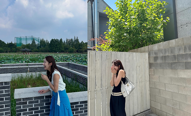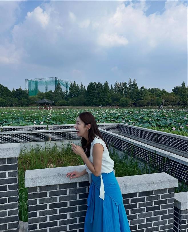 화이트 민소매 블라우스와 블루 스커트의 조합으로 상큼하고 청량한 매력을 연출하고 있다. 연꽃이 피어있는 자연스러운 배경과 어우러져 더욱 싱그러운 분위기를 자아낸다. 허리에 매듭 디테일이 있는 블라우스가 실루엣을 살려주며, 전체적으로 여성스럽고 우아한 룩을 완성하고 있다.