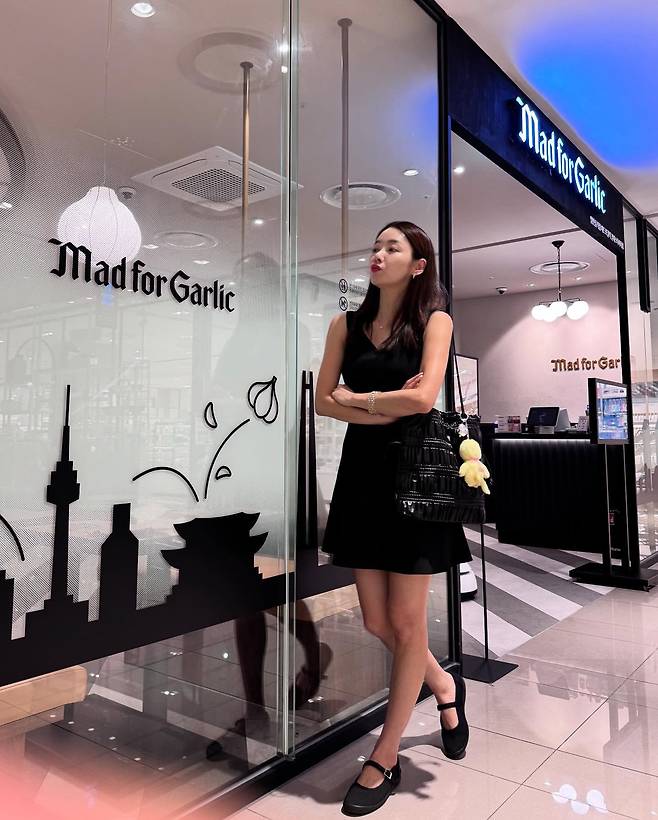 시퀸 장식이 돋보이는 검은색 미니드레스로 화려하고 세련된 매력을 연출하고 있다. 스트랩 힐과 함께 다리 라인을 강조하며, 전체적으로 글래머러스한 분위기를 자아낸다. Mad for Garlic 매장 앞에서 포즈를 취한 모습에서 도시적이고 모던한 감각을 드러내고 있다.