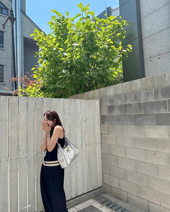 검은색 원피스 하나로 심플하면서도 우아한 스타일을 연출하고 있다. 화이트 핸드백과 로프 벨트가 포인트가 되어 단조로울 수 있는 블랙 룩에 생동감을 더하고 있다. 도심 속 일상적인 공간에서도 세련된 패션 감각을 드러내며, 미니멀한 아름다움을 강조하고 있다.