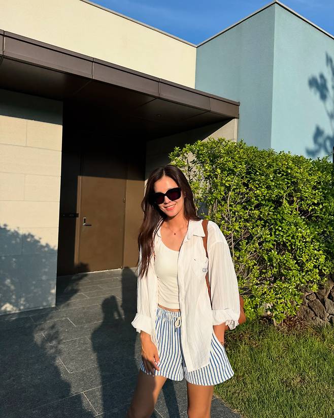 실내외 어디서든 편안하게 소화할 수 있는 조합이지만, 그녀가 입으면 단정하면서도 여유 있는 휴양지 감각이 완성됐어요.